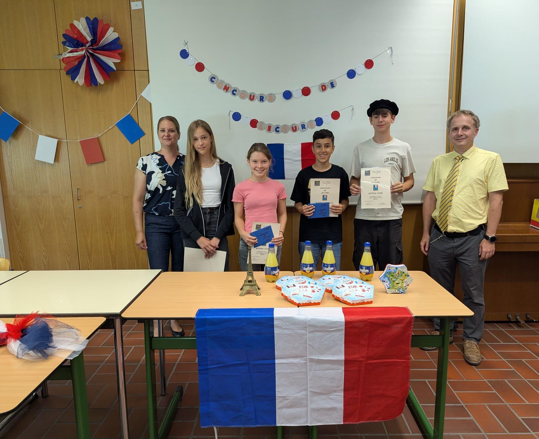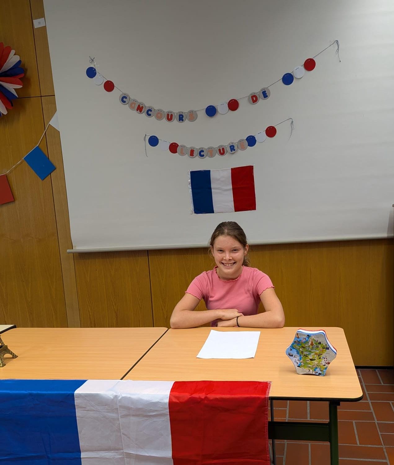 Am 11. Juli 2025 fand der Schulentscheid des Vorlesewettbewerbs Französisch für die 7. Jahrgangsstufen statt, für den sich die Klassenvertreter Mahdi Hammouda, Leopold Vogel, Maxima Sturm und Maren Wolff vorab qualifizieren konnten. Hier galt es, einen vorbereiteten Text und einen doch recht anspruchsvollen unbekannten Text aus einem französischen Jugendbuch zu präsentieren. Die Jury – bestehend aus den beiden Französischlehrkräften Gabi Gut und Christine Harzer, Constanze Fürst als Fachbetreuerin Französisch, der Vorjahressiegerin Emma Grund und Annika Thöle als Vertreterin des Fördervereins – war sich jedoch schnell einig und so konnten Maxima Sturm als 1. Schulsiegerin und Mahdi Hammouda als 2. Schulsieger in einer anschließenden Feier mit französischen Spezialitäten gewürdigt werden.